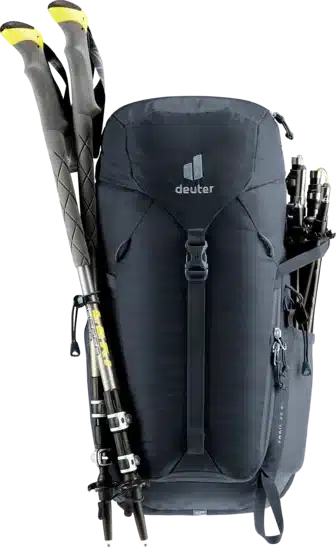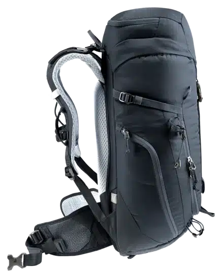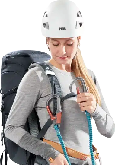 Das Airstripes Rückensystem mit geringer Rückenauflage und großen Belüftungskanälen sowie die perforierten Schulterträger und Hüftflossen sorgen für optimale Luftzirkulation, eine körpernahe Gewichtsverteilung und damit einen kompakten Sitz in jedem Terrain. Die flache Deckelkonstruktion bietet gute Kopffreiheit – auch mit Helm. Dank Fixierungen an den Schulterträgern sind die Karabiner des Klettersteigsets stets griffbereit. Zudem sind Ausrüstungsgegenstände und Material dank großem Reißverschluss-Frontzugang und Seitentaschen schnell zur Hand.