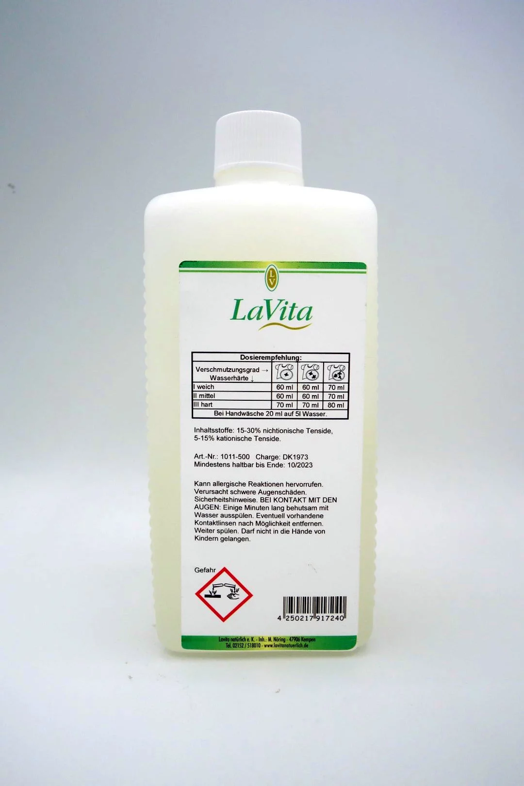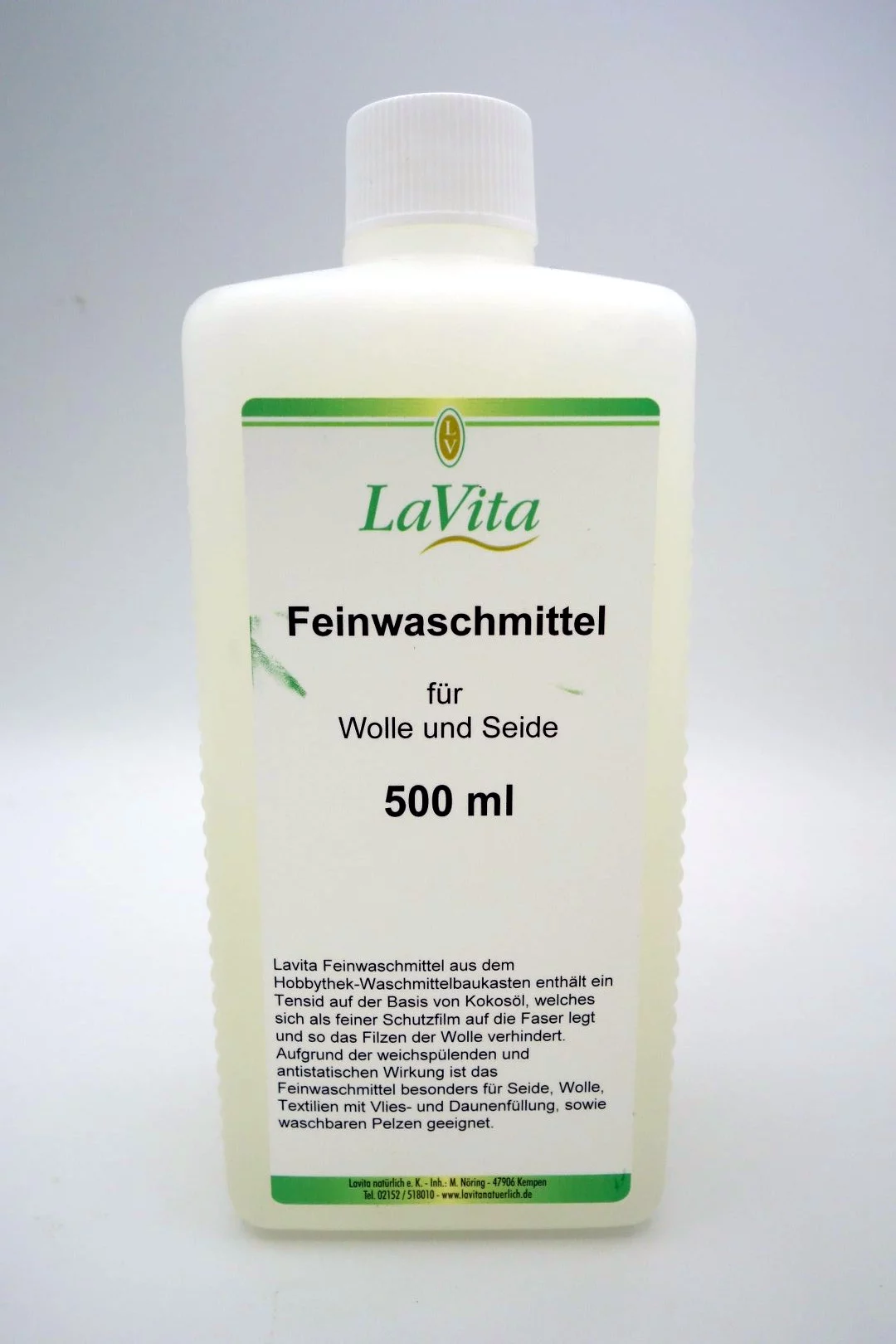 Das LaVita Feinwaschmittel enthält ein Tensid auf der Basis von Kokosöl, welches sich als feiner Schutzfilm auf die Faser legt und so das Filzen der Wolle verhindert. Aufgrund der weichspülenden und antistatischen Wirkung ist das Feinwaschmittel besonders für Seide, Wolle und Textilien mit Vlies- und Daunenfüllung geeignet.