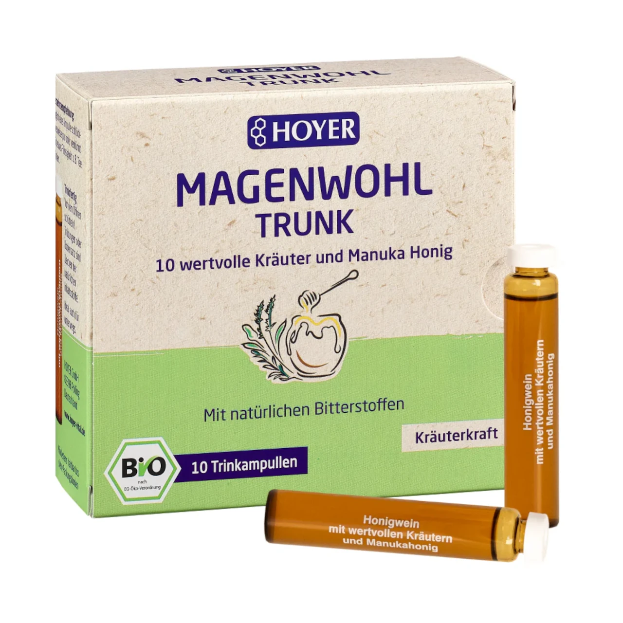 HOYER Magenwohl Trunk – eine ausgewogene Kombination aus 10 magenfreundlichen Kräutern und hochwertigem Manuka Honig MGO 250+.