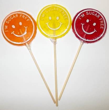 Der Lutscher ohne Zucker in den Farben Orange, Gelb und Rot.