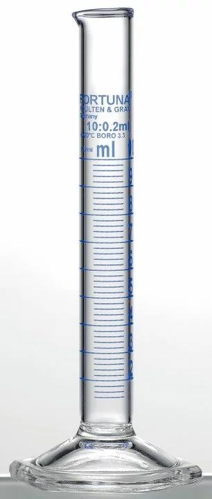 Beschreibung: Messzylinder, hohe Form aus Borosilikatglas, DIN 12680, Klasse B. Mit Sechskantfuß.