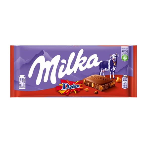 - Verkehrsbezeichnung: Milka Daim Schokolade Alpenmilch Schokolade mit Mandelkaramellstückchen (20%).