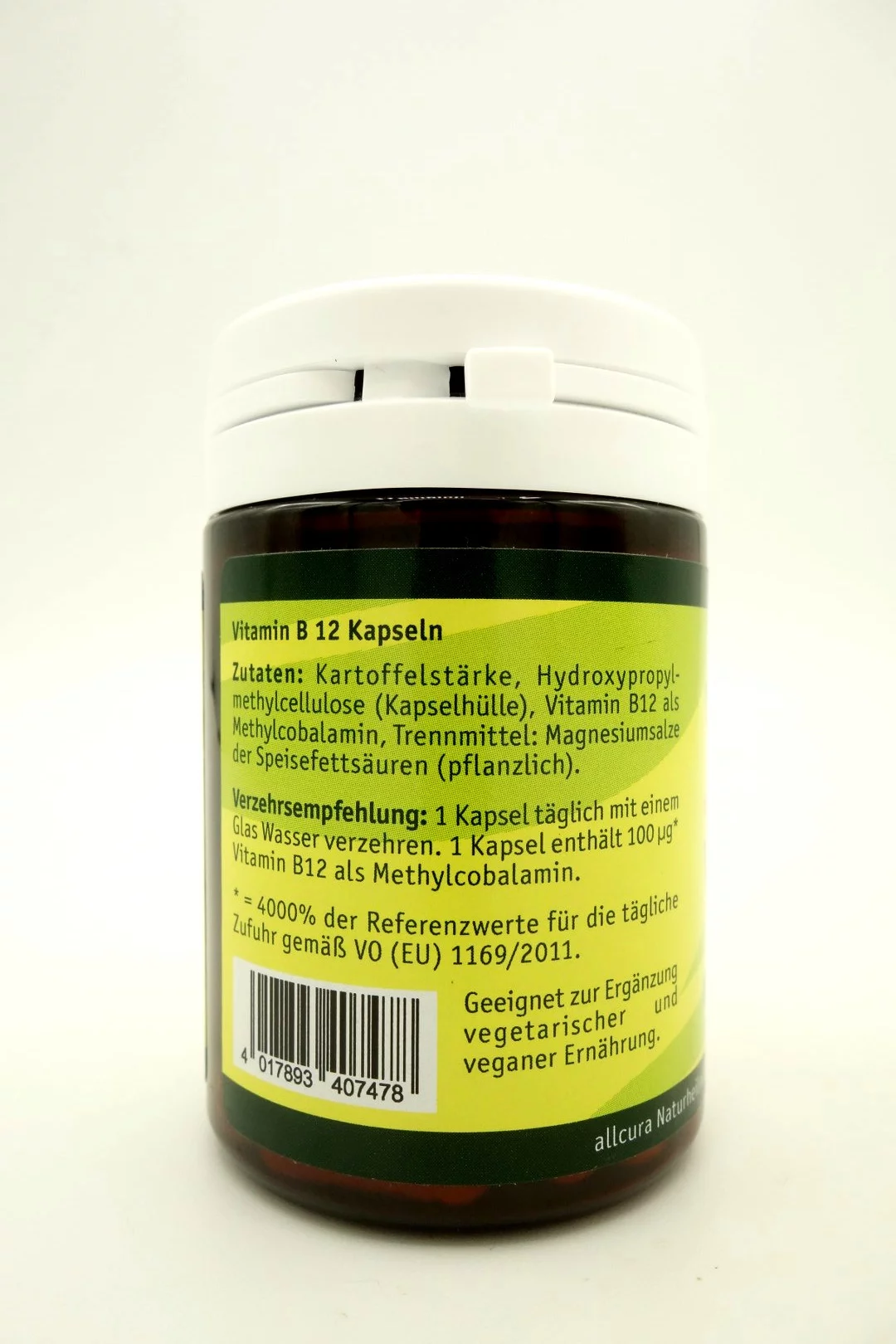 Kartoffelstärke, Hydroxypropylmethylcellulose (Kapselhülle), Vitamin B12 als Methylcobalamin, Trennmittel: Magnesiumsalze der Speisefettsäuren (pflanzlich).