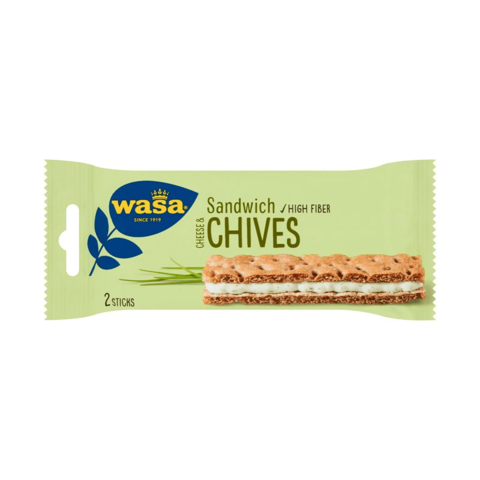 De sandwich van Wasa bestaat uit twee repen. Door de handige verpakking kan je het eten waar en wanneer je maar wilt. Deze sandwiches hebben de hartige smaak van roomkaas met een frisse bieslook noot. Er zitten 24 repen à 37 gram in een doos.